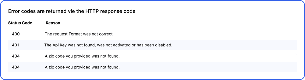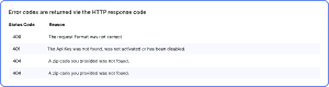 At the end of the page, a comprehensive table lists all possible error codes related to the APIs. This reference equips users with troubleshooting information and enhances the overall user experience by addressing potential issues proactively.